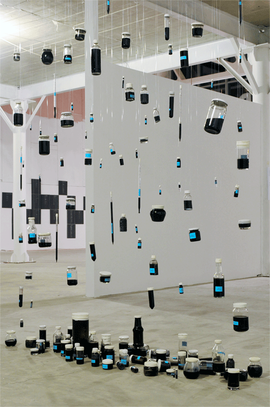| Man, outlined by what he owns, can be defined through the way and the purpose he uses the finite resources. The Installation "One Day in Oil" is a comment on overpopulation filtered through disturbing anomalies of necessary oil consumption and expresses the fate of the self-declared master of resources. Obsessed with the perpetuation of its genetic material, ignoring the ravaged world left as a legacy, is the emblematic feature of the man programmed to possess and consume everything. The oil dependency for contemporary human existence is obvious. Everything is oil. Every object, action, body, concept can be reduced to oil consumption. The entire traumatizing existence of the self destructive contemporary man, defined by what he eats, thinks, feels, is reduced to 0.01 barrels of oil per day. Consequently the human raw material has changed, contemporary man is more oil than earth. | ||||||