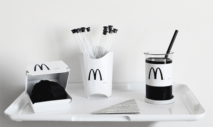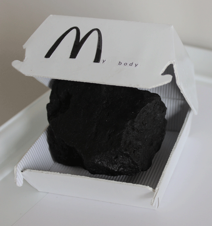 | “Last Supper Meal” is an object display, part of the exp(x) series which addresses the present day issue of fossil fuels dependency. Displayed as a tray with fast food meal on it, the work containing three-forms of fossil fuel is referring to a final capitalist transubstantiation of man into resource consumption and the resource itself. The self proclaimed master of resources, guided by its endless consumerist need, becomes both the actual consumption and the consumable mass. This change is as basic as our need to feed ourselves, part of our daily meal, it is irreversible and permanent Eucharist of capitalism. | |||