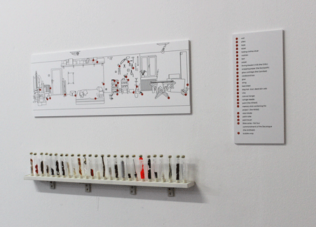 The interval between my physical studio at latitude - longitude: 45.768125,21.220539 and the digital folder containing information stored on my computer, seemingly unlimited, is the focus of this project. The project containing the 26 glass cartridges each with a sample collected at Latitude - Longitude: 45.768125,21.220539, in an area of 12 square meters, is converting physical samples into digital data, sampling the multi-functionality of my workspace into representation of objects/conditions and thus of activities/life that take place in the workroom. Sampling at localized latitude and longitude and transforming the 26 collected samples into non-spatial data formulates an analysis of the workspace but also of its function. The incalculable interval formed by this process of transforming the reality into the virtual is formulating the “reality of the virtual” as the most dynamic layer of the project, since the physical process of sampling my workroom will be finalized through a depositing of the collected samples in a box, while the digital data will be published via Internet. Collecting samples and establishing a map of samples reveals that both my present workroom and my digital data bear a fading reminiscence of my atelier painter tuition. In fact the content of few cartridges and the map express the trail of dissolving the status of a painting studio and transforming it into multifunctional workspace. The project is localizing my insignificant studio, sampling its present transitional status and forming a narrative that is delocalizing an individuation of activities of a singled out 12 square meters into a information available beyond its geographical constraints. |