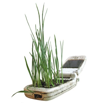 Eco-mob, 2009, mobile phone with earth and grass, 5 x 4 x 15 cm