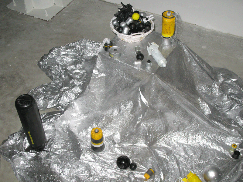 | In the installation "Still Life" traditional still life objects are replaced with elements of cluster bombs, which are bombs that are fractured and contain munitions or small bombs that are spread out over large areas in order to destroy military targets. According to humanitarian organizations cluster bombs are not effective against military targets, 95% of the bomb victims are civilians. Unexploded bombs remain active and cause death long after military conflicts, negatively affecting a long period of peace-building efforts. 10 years after the bombing of Serbia by NATO forces unexploded cluster bombs still represent a mortal danger for tens of thousands of people. Munition of these bombs is common in zones affected by war, as frequent as the fruit in a still life, arranged in a basket and scattered to abundance, they are far from being as harmless. | ||