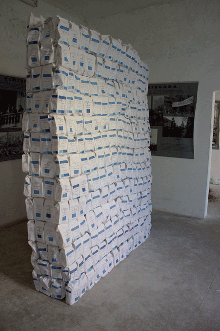 | The wall made out of empty FEAD (The Fund for European Aid to the Most Deprived) flour bags, destined to provide part of the basic meal to people across Europe who cannot afford it, is addressing the issues of marginalisation through charity and aid as business. Officially through FEAD, EU seeks proud-spirited to “bring people in from the margins of society” while in practice occasionally this short term visit from the margins is a cover up for a profitable business of those in the centre. A striking example of how you can impoverish the poor by enriching the rich, while promoting democratic equality, insuring rights that have less and less factual significance. This comparative inequality, the lines of some people waiting for their EU mercy aid, carries a resemblance with food rationing during the communist regime of 1980s Romania when absolute equality was insured by making everyone equally poor. For those that remained in line, the distinction between present comparative inequality and past absolute equality, bears too little weight, while this fenced solidarity of the EU aid industry builds an insurmountable wall of dependency. | |||